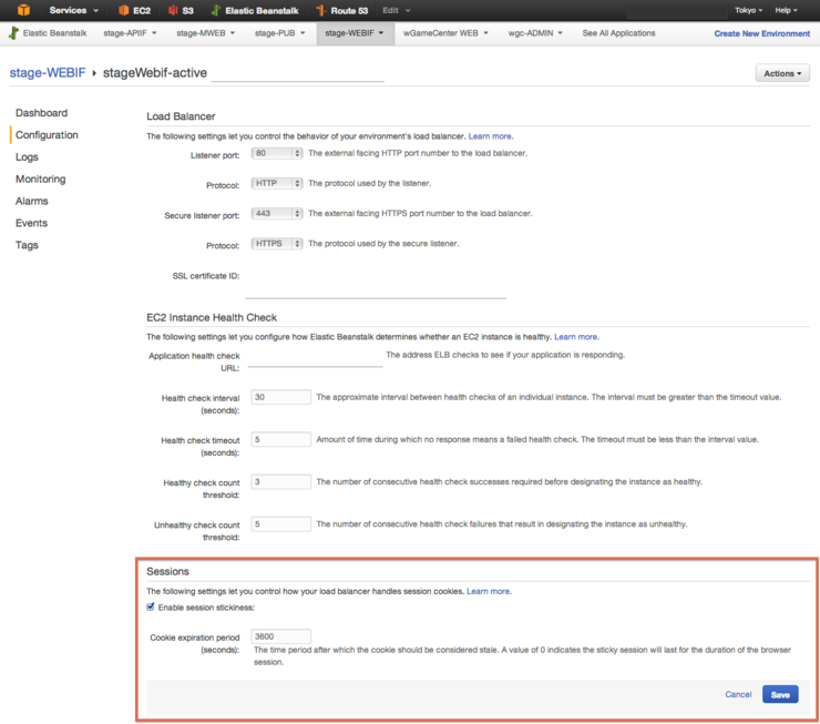 자, 이제 세 개의 필드셋으로 구분된 로드밸런싱 환경 설정 페이지가 보이시나요? 위에서부터 차례로 로드 밸런싱할 포트 등 기본 정보를 세팅하는 [Load Balancer] 항목, 로드밸런싱을 하기 위한 헬스체크 정보를 세팅하는 [EC2 Instance Health Check], 마지막으로 우리가 설정해야 할 [Session] 항목이 있습니다.